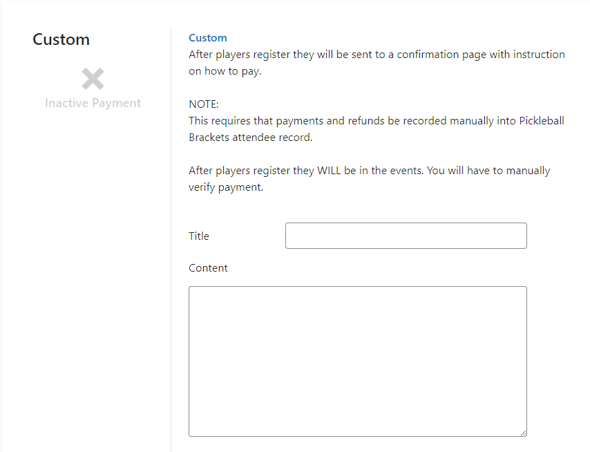 If you have another platform that you already use for payment accepting, you can enter the URL here to have players automatically transferred to that location to make payment. Using this function will NOT record payments in the system, you will need to manually record their payments.