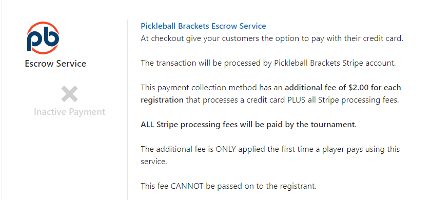 If you want to have players pay online but don't have a Stripe or PayPal account of your own, you can choose to use our Stripe account. This option does include an additional $2.00 per player fee that you will be charged at the end of the tournament. If you want to use this option, just fill in the information in this section and hit activate and your done.