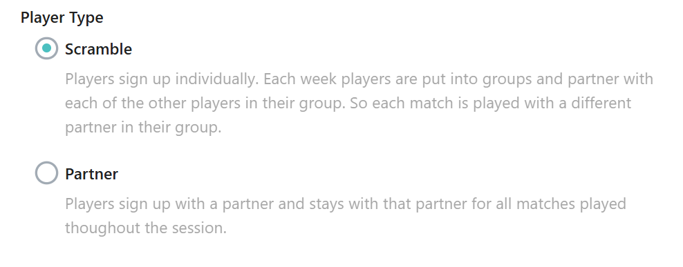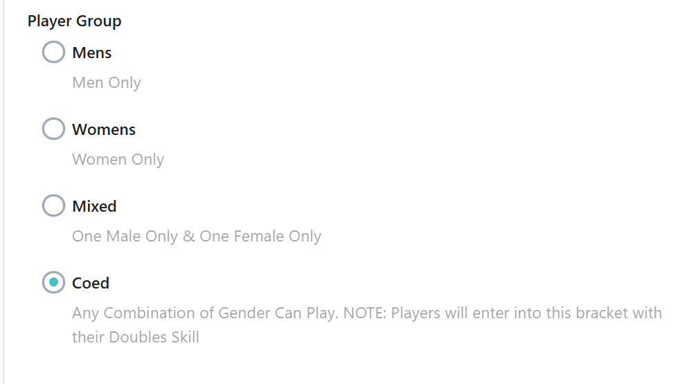 Player Group: Choose if the league will be men's, women's, mixed or coed. Mixed only refers to Partner leagues. This is not current ability to created a mixed doubles scramble league.