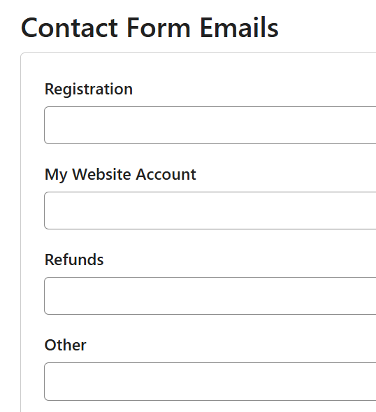 Contact Form Emails: These options will default to the Primary Contact email address unless you enter something different. For example, if another club manager handles all finances, you might want that person to receive all refund requests. Please provide the email in the space provided.