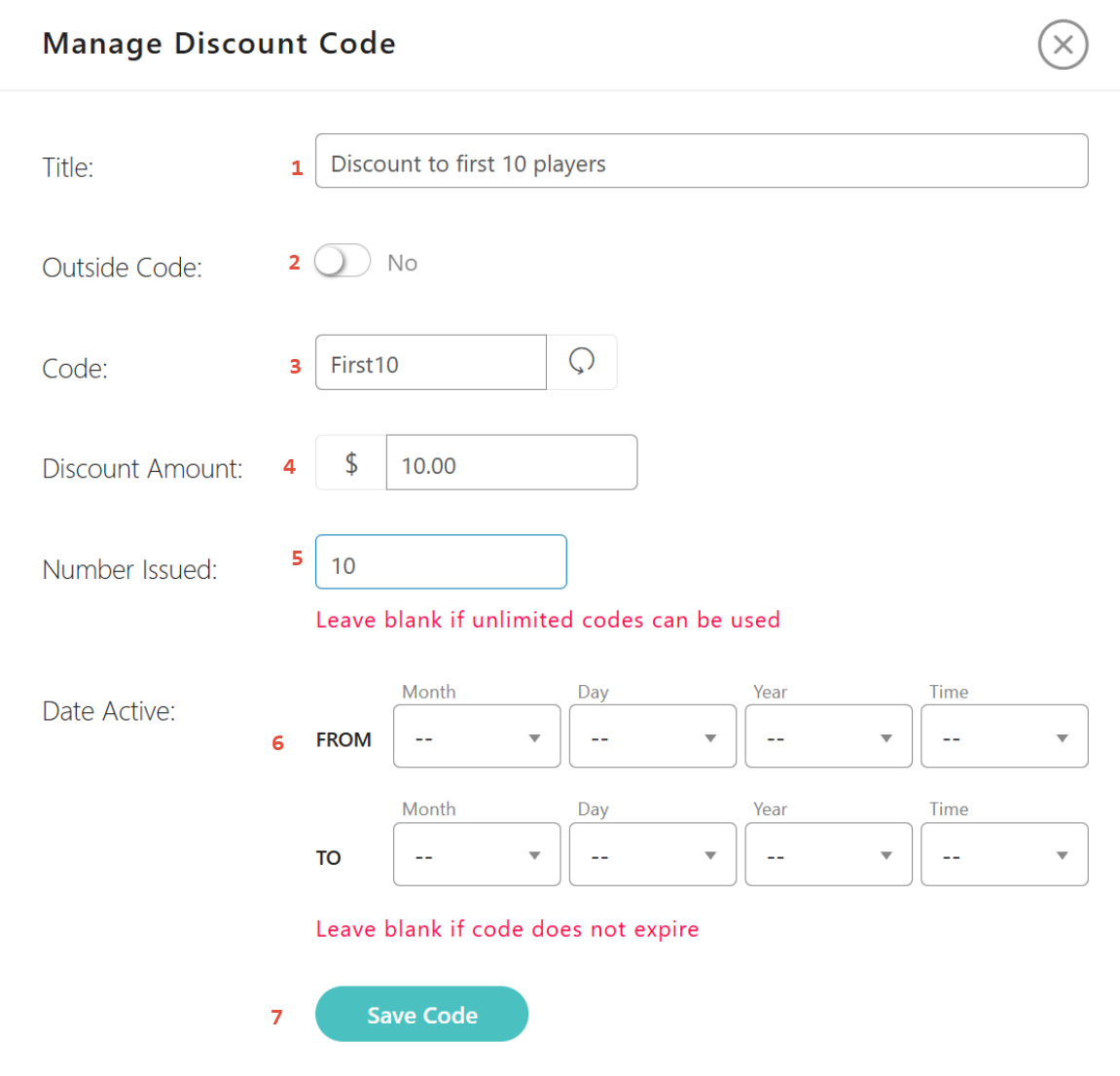 5. Number Issued - Use this to limit the number of discounts available. This feature can be used to promote a tournament by offering discounts to only the first X number of players to register.
