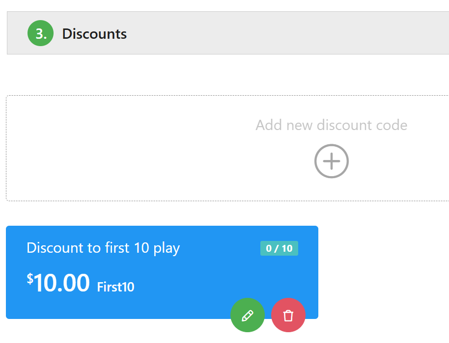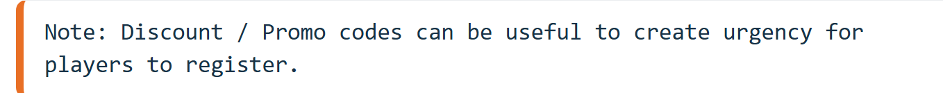 When it comes to discounts, you might want to reward standout players, volunteers or sponsors. For instance, if Betty is a star player, you could give her a discount code like "BettyBoop" for $10 off her session. Just make sure it can only be used once to prevent sharing.
