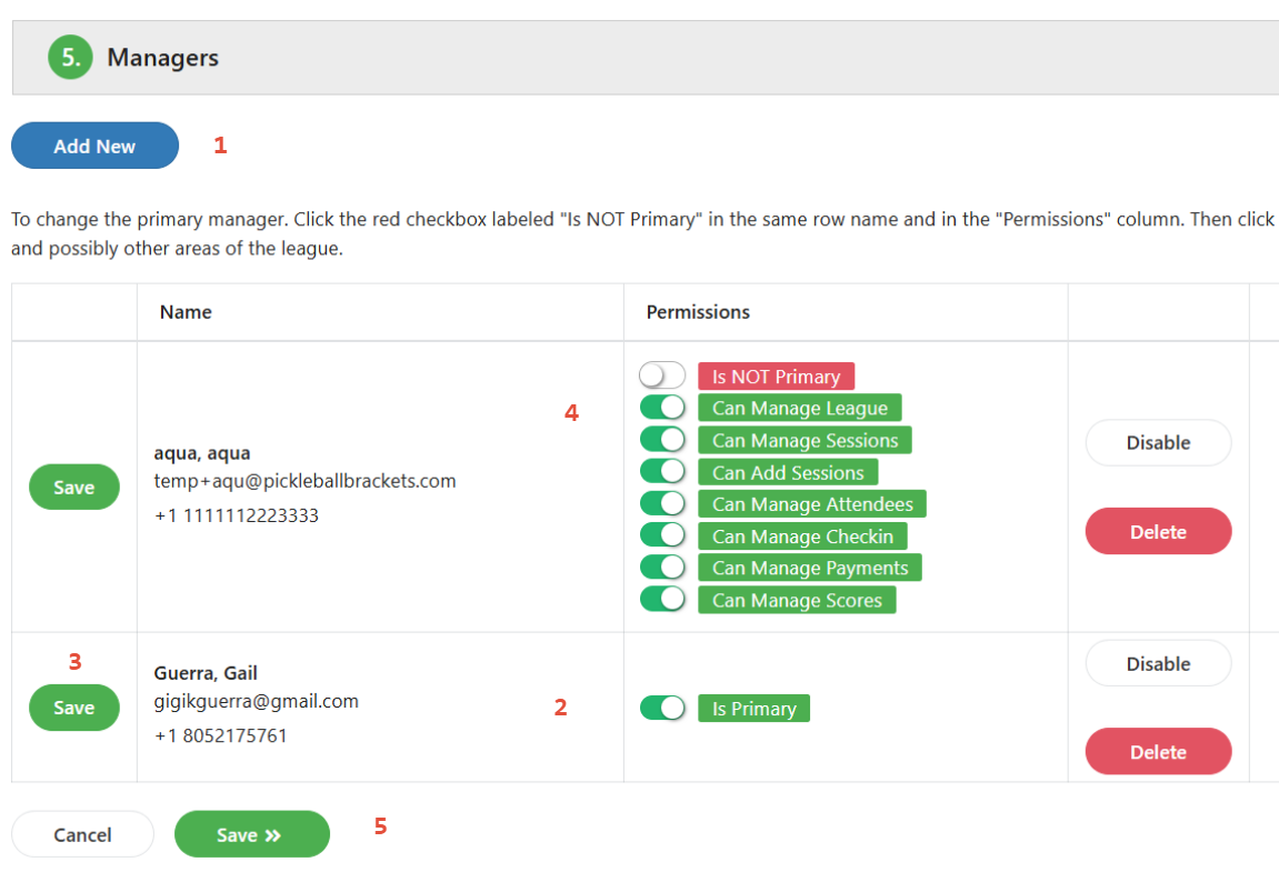 1. Add New - Use this tab to add a manager. Any manager must have an account with Pickleball.com. Once the prompt comes up, type in their last name and then search for them amongst the accounts. Select the player you would like for your manager.