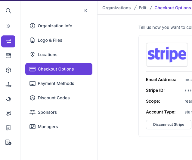 • Stripe - If you choose to use Stripe, ensure it’s set up in your organization first.
