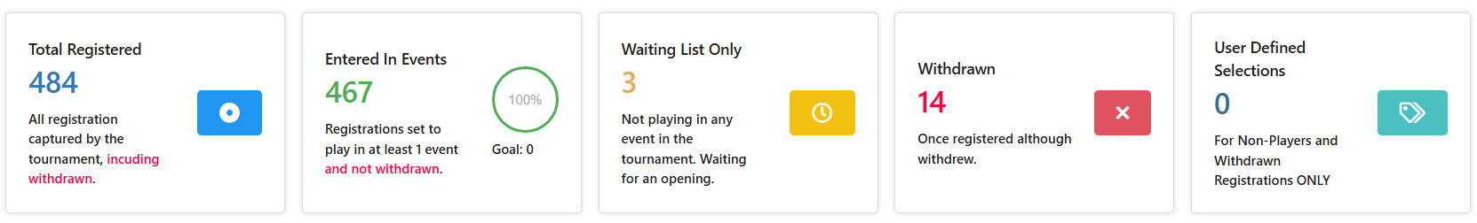 The Dashboard is going to give you an up-to-date breakdown of the registered players in your tournament. The last option "User Defined Selections" is referencing an option we offer to create a purchase button on your tournament listing that is available to those not playing in the tournament. This could be for Tournament Shirts, Donations, are any goods you wish to provide to non players attending the event.