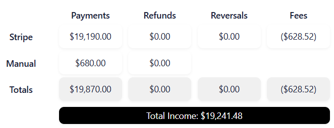 Stripe - Payments - This is the total recorded amount from Stripe that has come in for your tournament from players