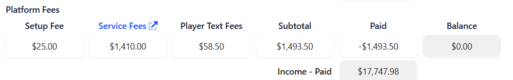 The Platform Fees section is keeping track of the Required Service fees and the Options Player Text Fees for the tournament. Below is a breakdown of each line: