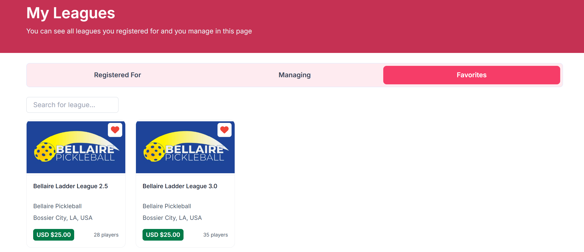 The price indicates that a league is open for registration. The price may reflect a full session price or a daily price depending upon how the League is configured.