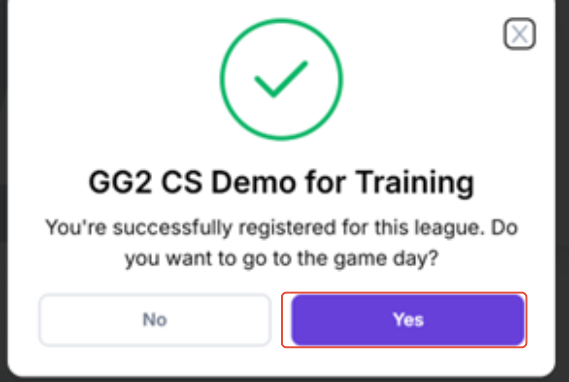 In the top right corner, click on the Register tab and this will register you for the current session. A prompt will display that you have successfully registered for this league. Click yes, if you would like to go to the game day.