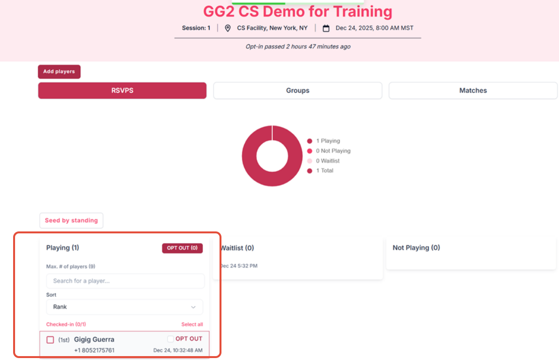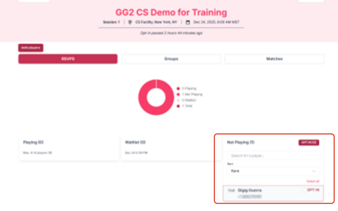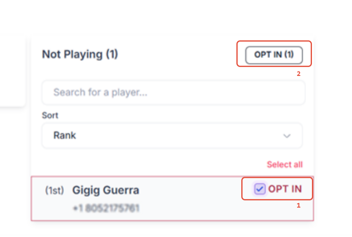 To opt in to play on the game day, click on the Opt In to the right of your name (1) and then Opt In Tab (2)