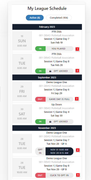 - The opt in time period is established by a date range. League managers may allow players to opt in for all game days as soon as they sign up for a session or limit the opt in date range to just the week or only a few days prior to the game day.