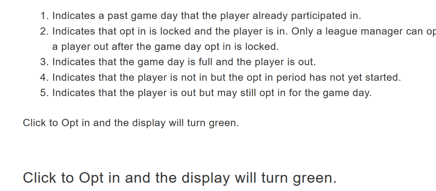 The Opt in process is used by players or the league manager to manage attendance for a specific game day.