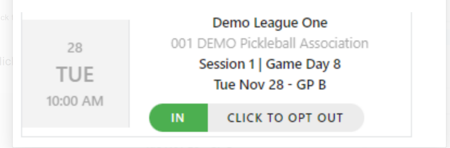 Players can opt themselves in or out from their phones or their computer by logging in to their pickleballbrackets.com account, selecting Leagues, My League Schedule, the name of the league and the Game Day button.