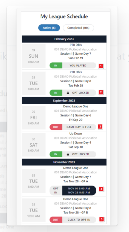 2. Indicates that opt in is locked and the player is in. Only a league manager can opt a player out after the game day opt in is locked.