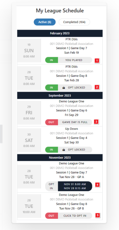 2. Indicates that opt in is locked and the player is in. Only a league manager can opt a player out after the game day opt in is locked.