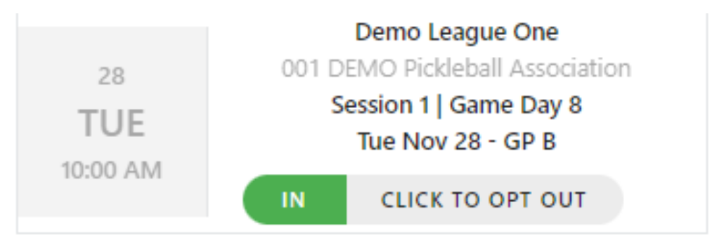 League Players can opt themselves in or out from their phones or their computer by logging in to their pickleball.com account, Leagues and then My Schedule.