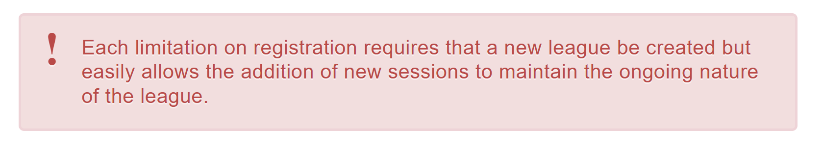 - If the league manager is managing all registrations, existing players can be quickly added to the new session while maintaining their league ranking.
