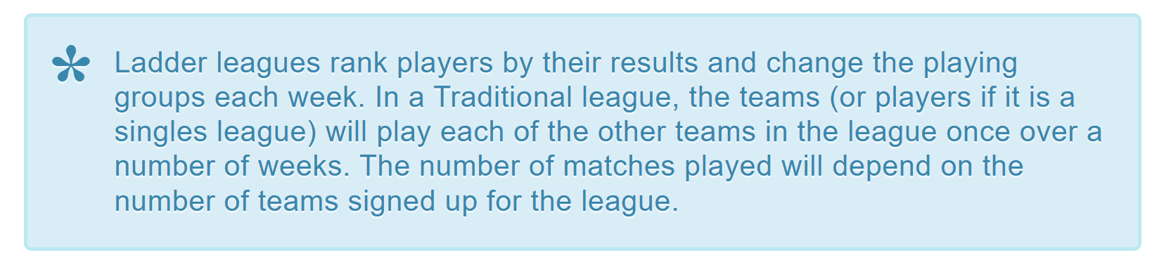 League Structure: Players will move up and down "ladder" based on match results.