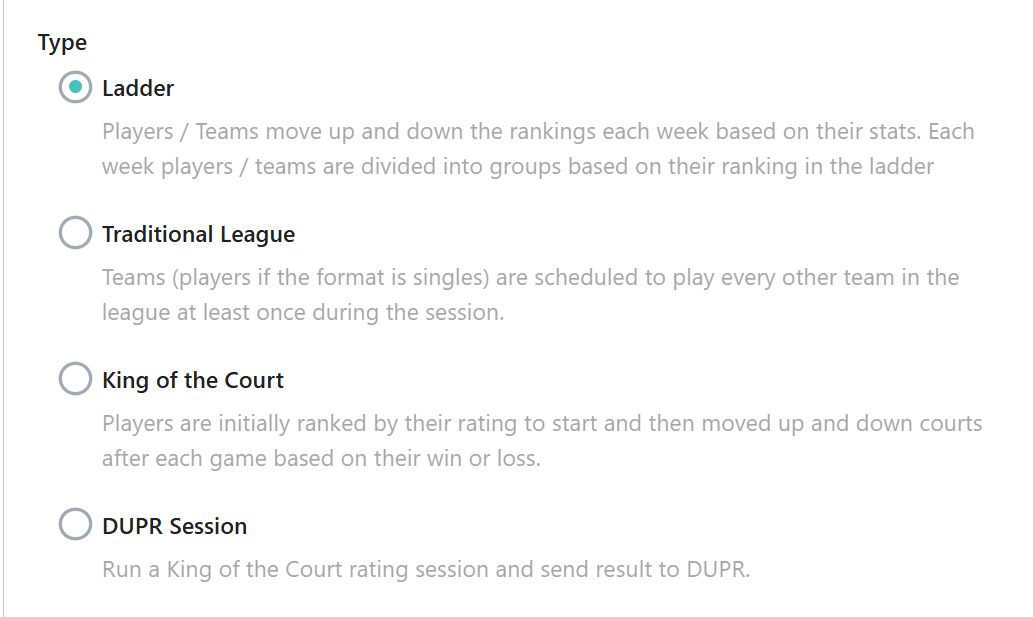 League Type: Choose from Ladder, Traditional League, King of the Court or DUPR.