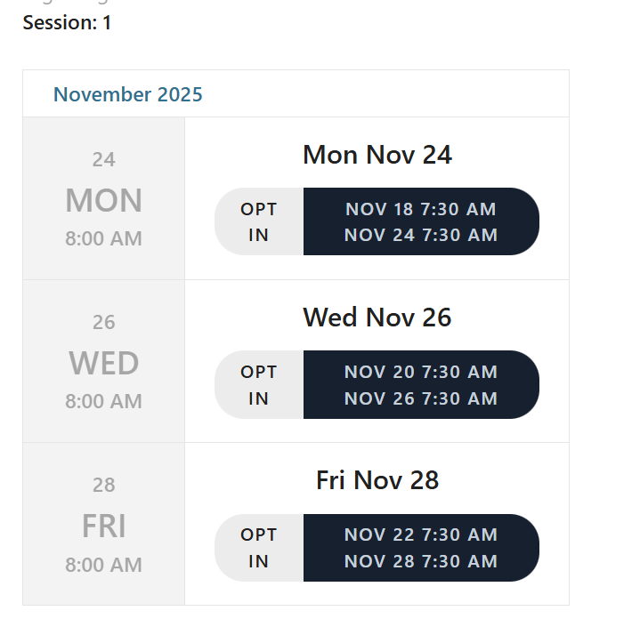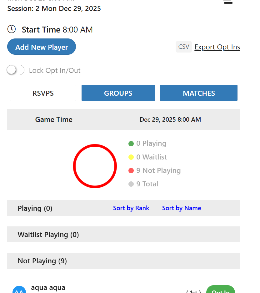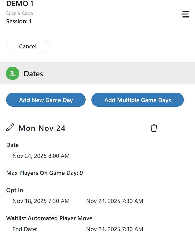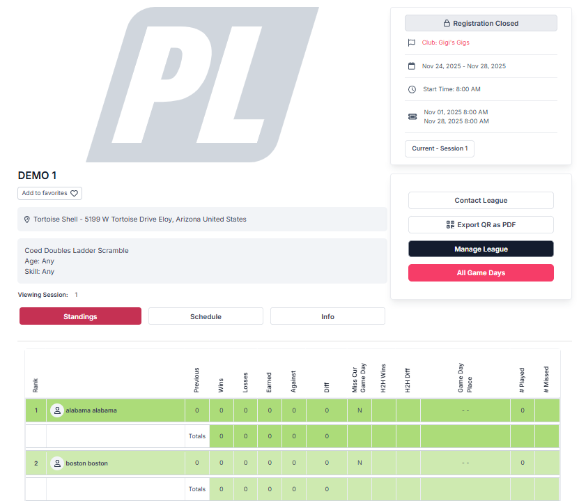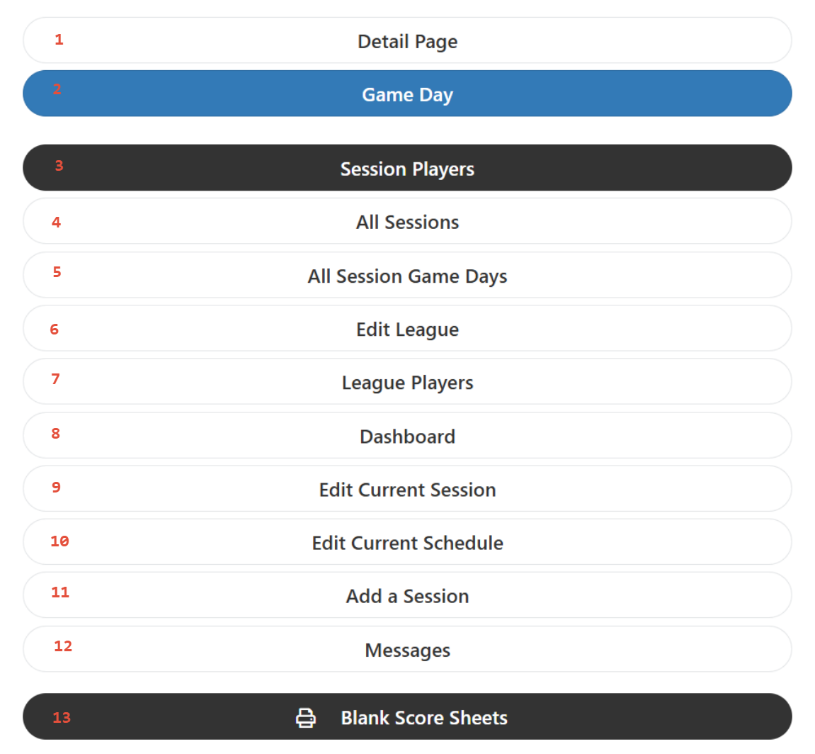 - All Session Game Days - This will list the game days for the current league session. It allows the league manager to opt players in or out, enter scores and manage play on the game day.