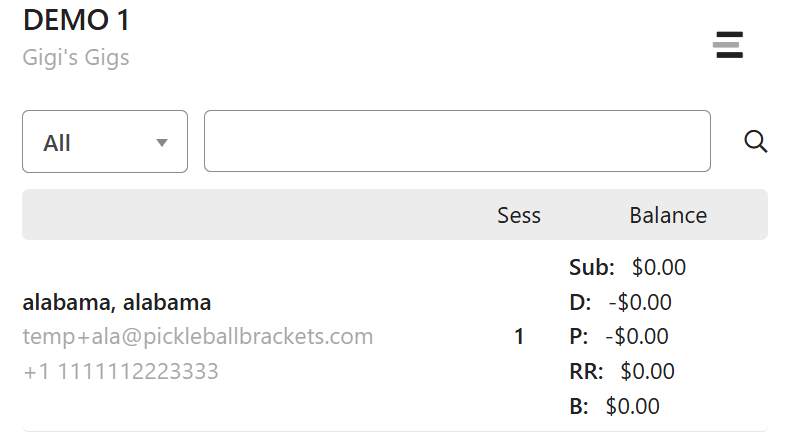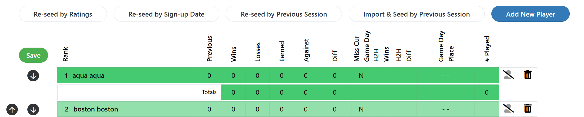 - Session Players - A list of the players registered in the current session as they are ranked on the ladder. League manager can add, delete, hide and move players.