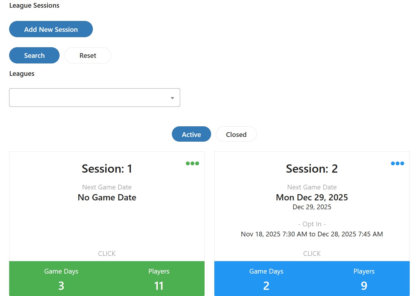 - All Sessions - This will list all of the league sessions and allow the league manager to edit those sessions or add a new session.