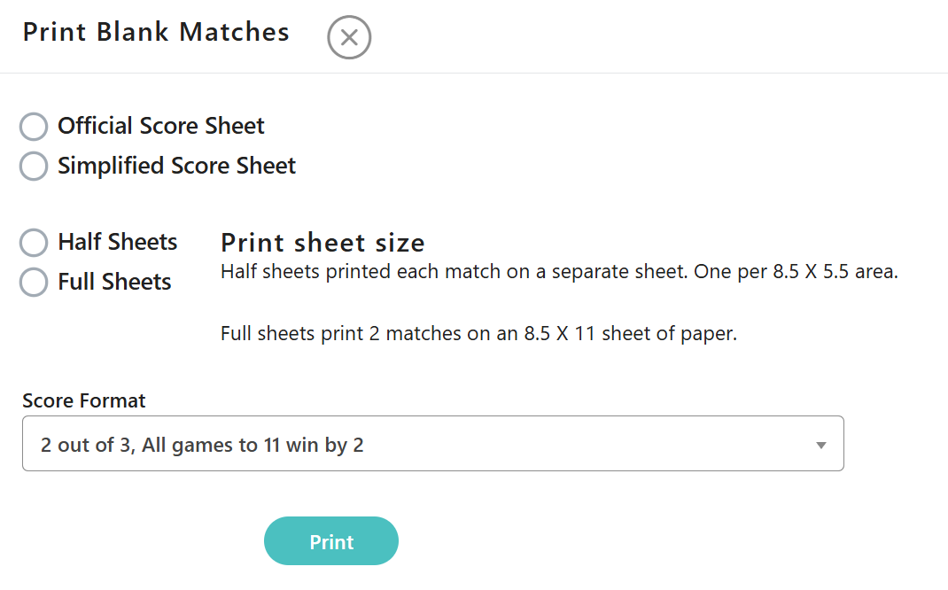 - Blank Score Sheets - Select this option to print blank score sheets in any scoring format.