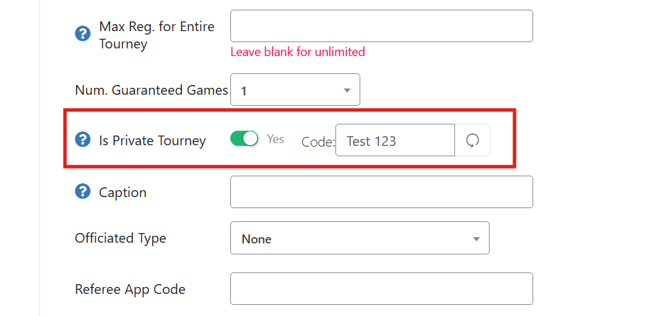 After turning this one, you have the ability to add in a personalized Code that you will provide to the player (or you can use the little arrow to the right for the system to generate one for you). This code can now be shared with any players you wish to be able to sign up for the tournament.