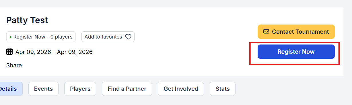 When the players head to the tournament listing, everything will appear as normal. They can click on the "Register Now" button to start the registration process.