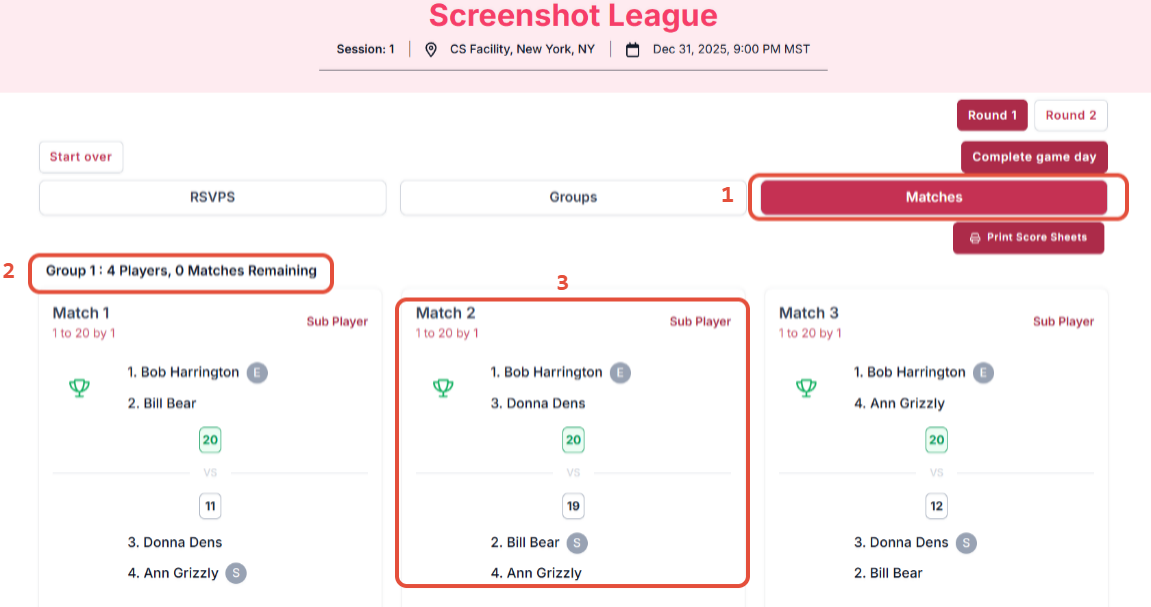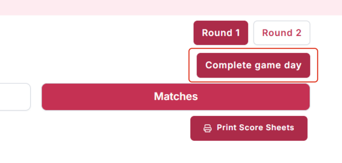 Once all scores have been completed, be sure to select Complete Game Day. This will recalculate the rankings for this game day.