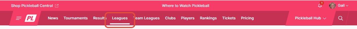 Start by logging into your Pickleball.com profile. Once logged in, click on the Leagues tab. All league searches and signups are initiated from this screen. Leagues are listed alphabetically.