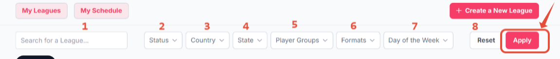 1. Search for a League - If you know the name of the League, type in here and click on Apply.