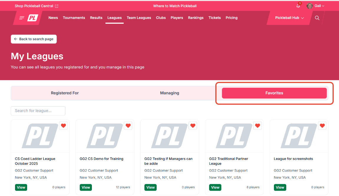 When you back to your profile and Click on My Leagues, your favorites can be found under your Favorites tab.
