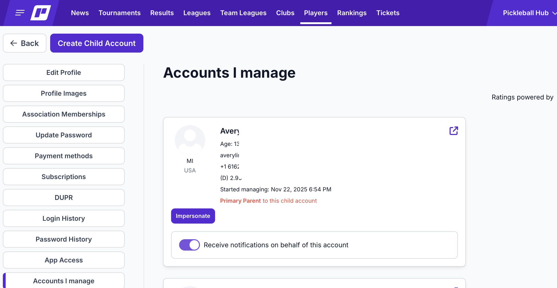 4. Next, choose the child that you would like to sign up for the tournament, and click the Impersonate button in their box: