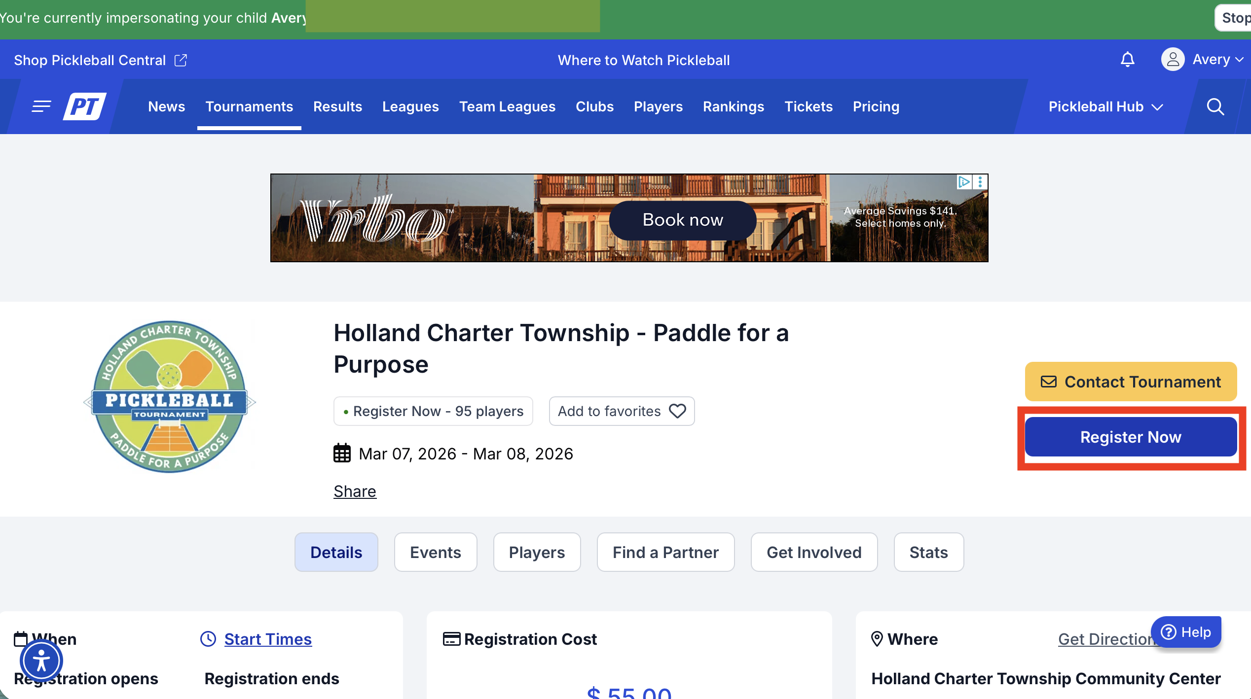 6. Go to pickleballtournaments.com and search for the tournament you'd like the child to be registered for. Click on it to go to the main tournament page.